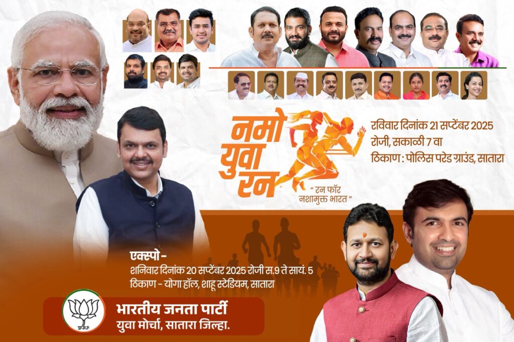 सातारा : भारताचे पंतप्रधान नरेंद्रजी मोदी यांच्या वाढदिवसाच्या निमित्ताने, भारतीय जनता पार्टी तर्फे १७ सप्टेंबर ते २ ऑक्टोबर या कालावधीत सेवा सुशासन पंधरवड्याचे आयोजन करण्यात येत असते.या सेवा सुशासन पंधरवड्या मध्ये आरोग्य, स्वच्छता, क्रीडा, चित्रकला स्पर्धा या आणि इतर सेवा विषयाचे कार्यक्रम सर्वसामान्य नागरिकांना बरोबर घेऊन केले जातात.याच कार्यक्रमांतर्गत दिनांक २१ सप्टेंबर रोजी संपूर्ण भारतात, प्रत्येक राज्यात, प्रत्येक जिल्ह्यात नमो युवा रन, मॅरेथॉन चे आयोजन करण्यात येत आहे.